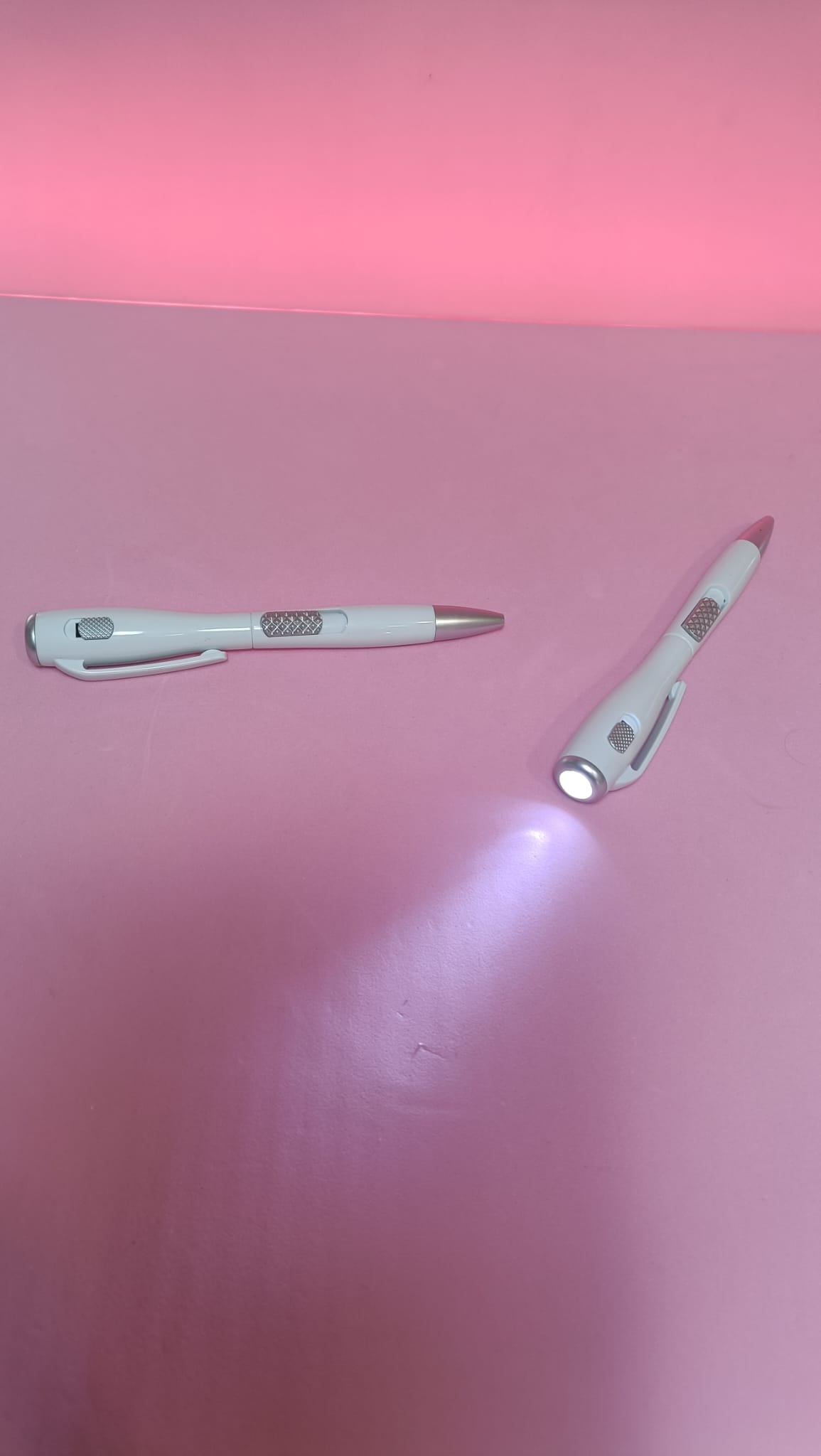 / Bolígrafo linterna blanco, escritura azul con pilas incluidas – Mín. 20 uds