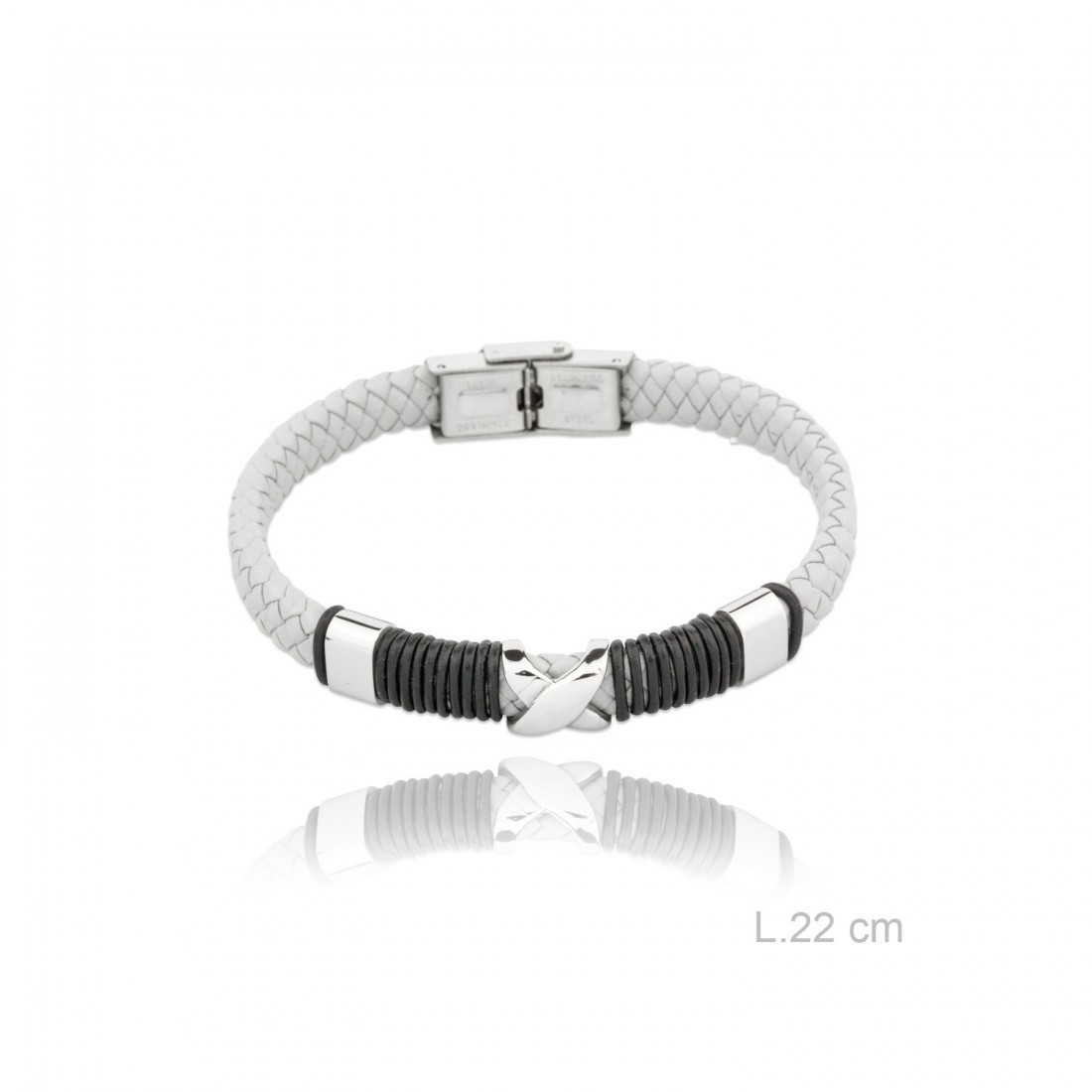 Pulsera acero y cuero blanco grabable con dos iniciales en zona de la X